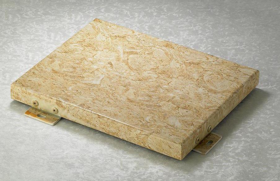 石紋鋁單板采用高強度鋁合金板材,經過數控折彎等技術成型,主要由面板、加強筋和角碼組成。加強筋與板面后的電焊螺釘連接,使之成為一個牢固的整體,極大增強鋁單板幕墻的強度與剛性,保證了長期使用中的平整性及抗震能力。